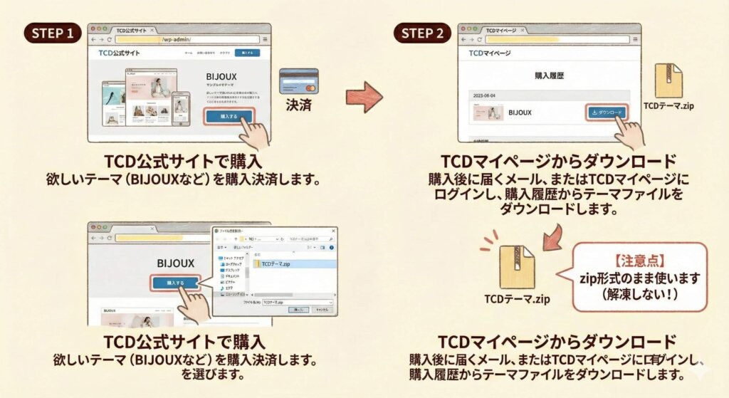 - 購入後に届くメール、またはTCDマイページにログインし、購入履歴からテーマファイルをダウンロードします。