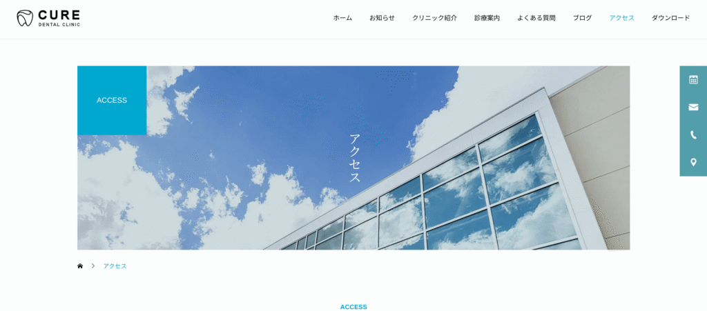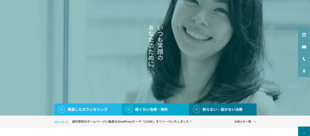- 清潔感のあるアニメーション: マウスを乗せた時にふわっと色が変化するCURE特有の微細なアニメーションが、医療機関に不可欠な「清潔感」と「優しさ」を印象づけます。