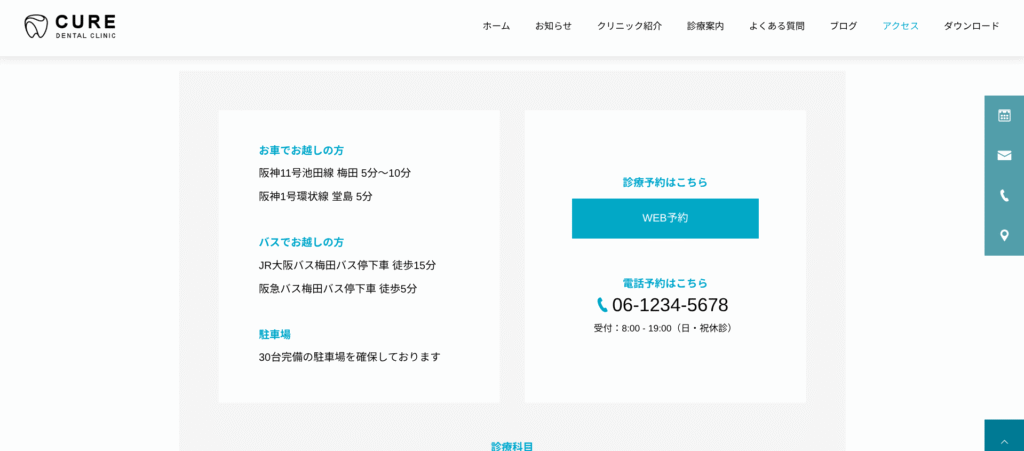 ここに「初めての方へ」「診療案内」「交通アクセス」という最も重要な入り口を固定表示することで、ページを開いた瞬間に患者の疑問を解決し、離脱を防ぎます。