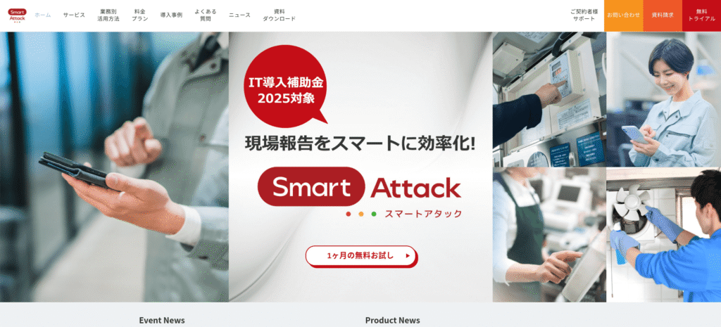 トップページに「お知らせ」や「実績紹介」を配置し、常に稼働している安心感を演出。
