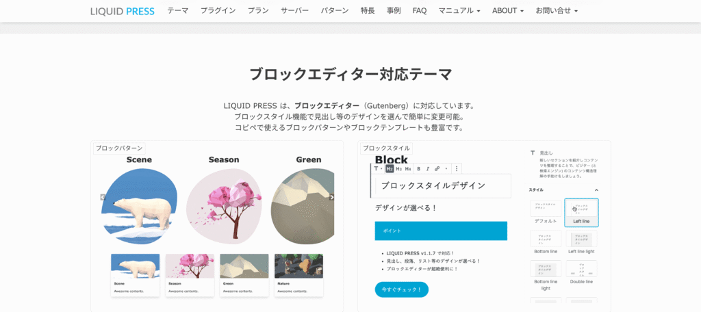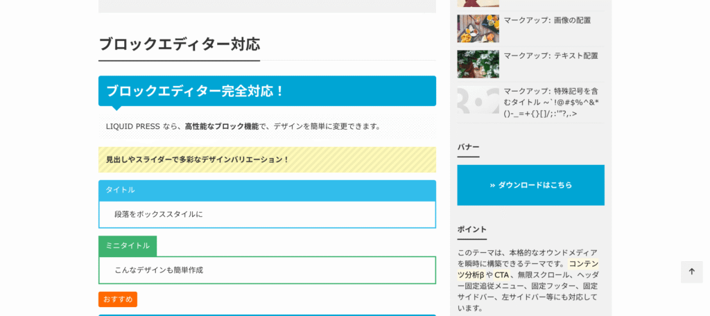 WordPressの標準エディタである「ブロックエディタ(Gutenberg)」への対応度において、LIQUID PRESSは非常に忠実です。