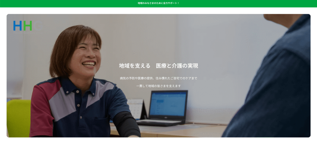 MONADの特徴である「フェードイン(ゆっくりとした表示)」のアニメーションを使い、スタッフの笑顔や施設の風景を柔らかく見せています。白と淡いグリーンを基調とした配色は清潔感があり、法人としての信頼性を高めています。